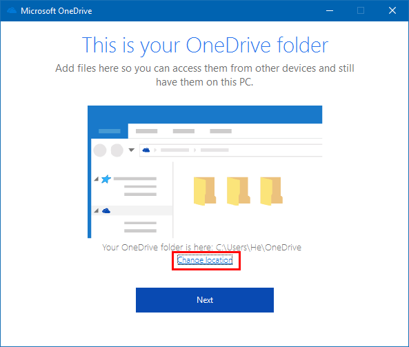 第11步:選擇你想要的下載(同步)到 PC 上的 OneDrive 文件夾,然後單擊下一個。
