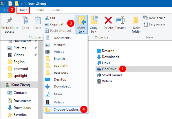 第四步:選擇OneDrive 文件夾,單擊家選項卡,然後單擊移至功能區中的按鈕,然後單擊選擇地點在下拉列表中。