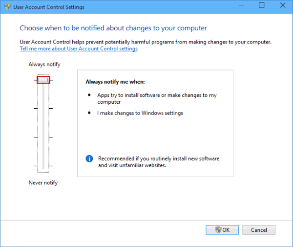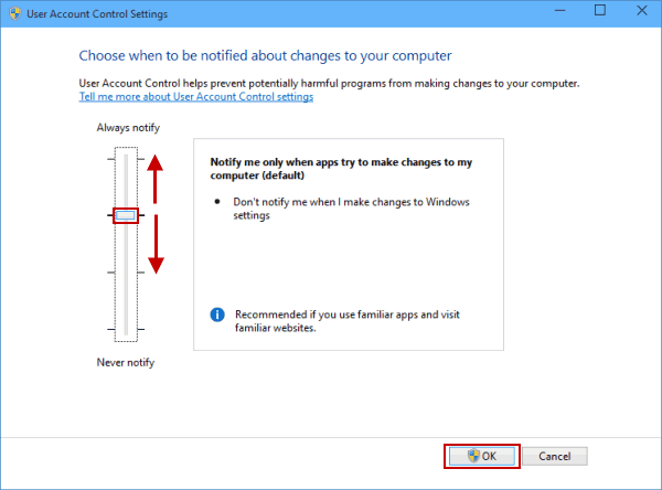 要將 UAC 恢復為其默認設置,請按照方法 1 將滑塊設置為第二高級別,然後單擊“確定”。