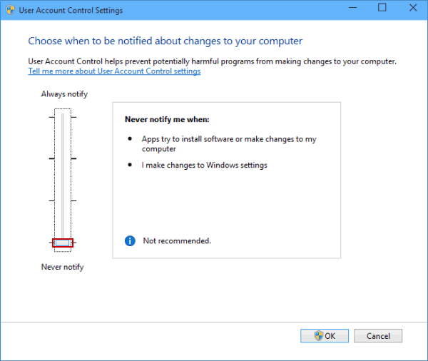4. 假設您不希望在應用程序嘗試安裝軟件並對您的電腦進行更改時以及在更改 Windows 設置時收到通知,請將刻度移至底部以選擇從不通知。