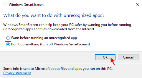 步驟 5:當系統提示您選擇 Windows SmartScreen 如何處理無法識別的應用程序時。選擇不要做任何事關閉 Windows SmartScreen選項。