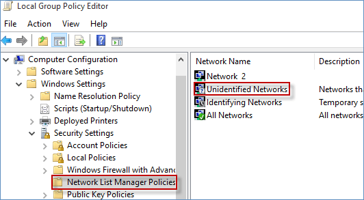步驟2:在本地團體政策編輯窗口,導航到Computer ConfigurationWindows settingssecurity設置網絡列表管理器策略。當導航到網絡列表經理政策, 按兩下身份不明的網絡。