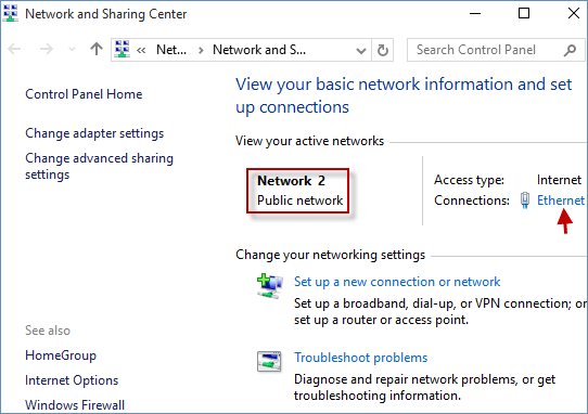 步驟4:轉到網絡和共享中心,您會看到網絡類型已更改為公共網絡。
