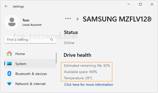 - 向下滾動到“推動健康”部分,您可以看到磁盤的當前溫度和估計剩餘壽命。