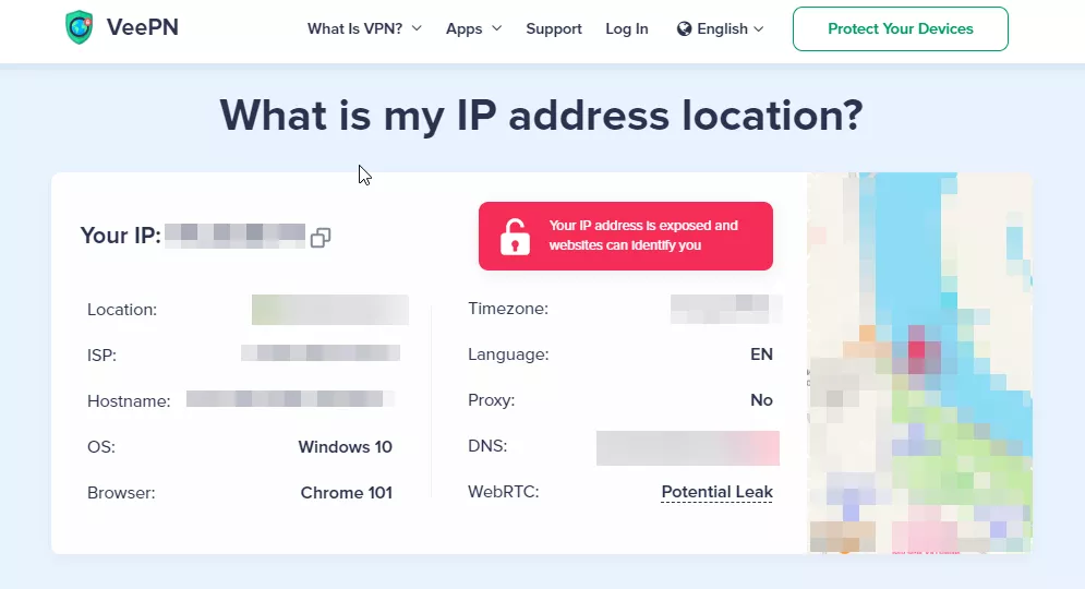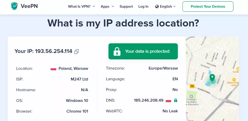 - 打開VeePN網站的“我的IP地址”頁面,檢查您的IP地址是否發生變化。如果沒有,那麼您的 VPN 無法正常工作。