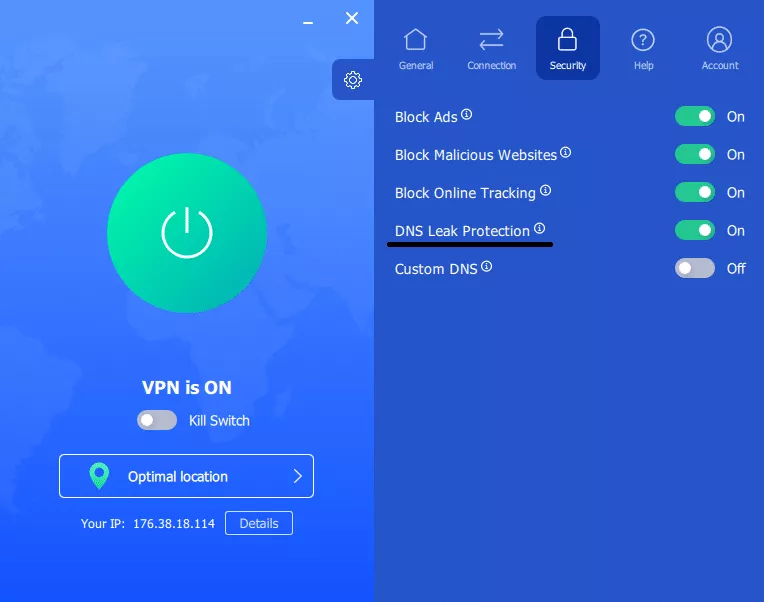 維PN隱藏您的真實IP地址,給您一個匿名的,並提供雙重安全性雙VPN功能。它還提供了一個終止開關和防止 DNS 洩漏— VeePN 通過加密隧道路由 DNS 查詢,並且不與外部 DNS 提供商交互。您可以在“安全”下的“設置”中打開此功能。 VPN PC 應用程序中的外觀如下: