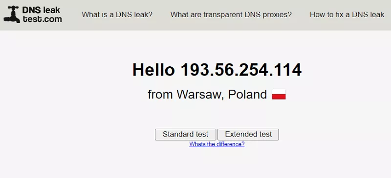 - 您還可以選擇“擴展測試”來獲取更多信息。如果結果仍然顯示您的新 IP 地址和位置,則說明您可以繼續操作,並且不會發生任何洩漏。