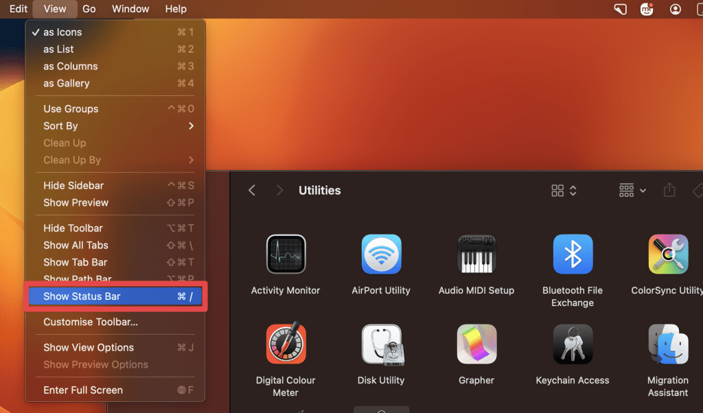 - 現在,Finder 窗口的底部將顯示一個狀態欄,其中包括您當前正在查看的設備(通常是 Mac 的主驅動器)上的可用存儲空間。