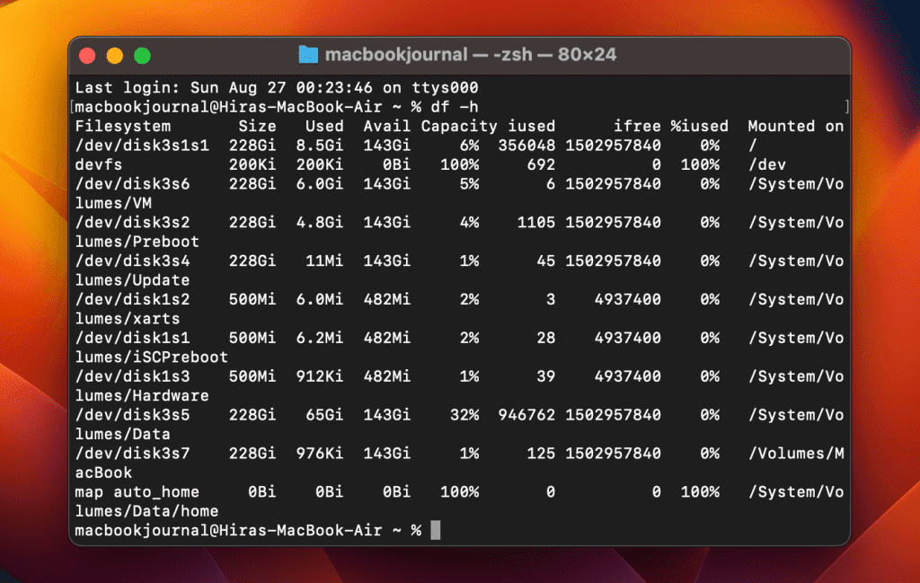 - 該命令將顯示已安裝卷的詳細列表及其存儲詳細信息,例如總大小、已用空間和可用空間。這些列通常是不言自明的,但您最有可能關注的是引用主磁盤的行,通常標識為 /dev/disk1s1 或類似的。
