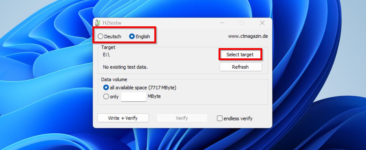 - 解壓下載的 .ZIP 存檔中的文件並啟動h2testw.exe.選擇您想要使用的語言。