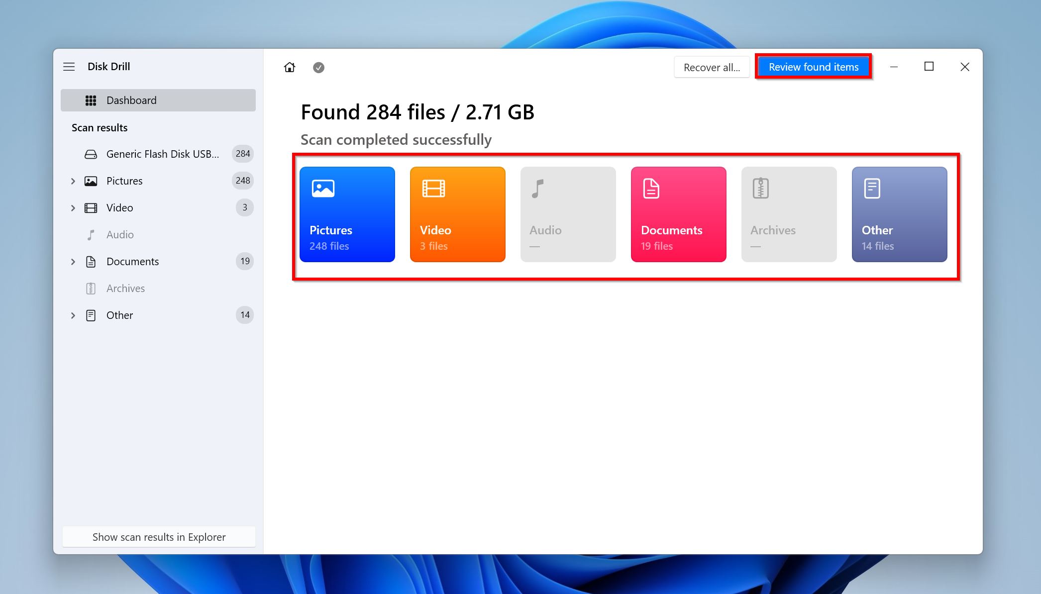 - 點擊查看找到的項目查看所有可恢復的文件。要僅查看特定文件類型,請單擊相關文件類型圖塊 - 圖片、視頻、音頻、文檔、檔案和其他。