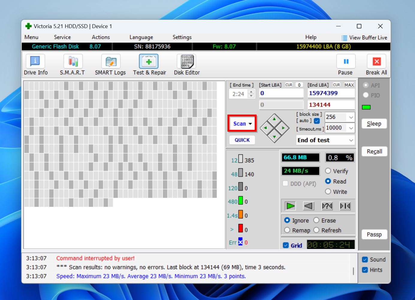 - 點擊掃描並等待 Victoria HDD/SSD 完成掃描筆式驅動器。