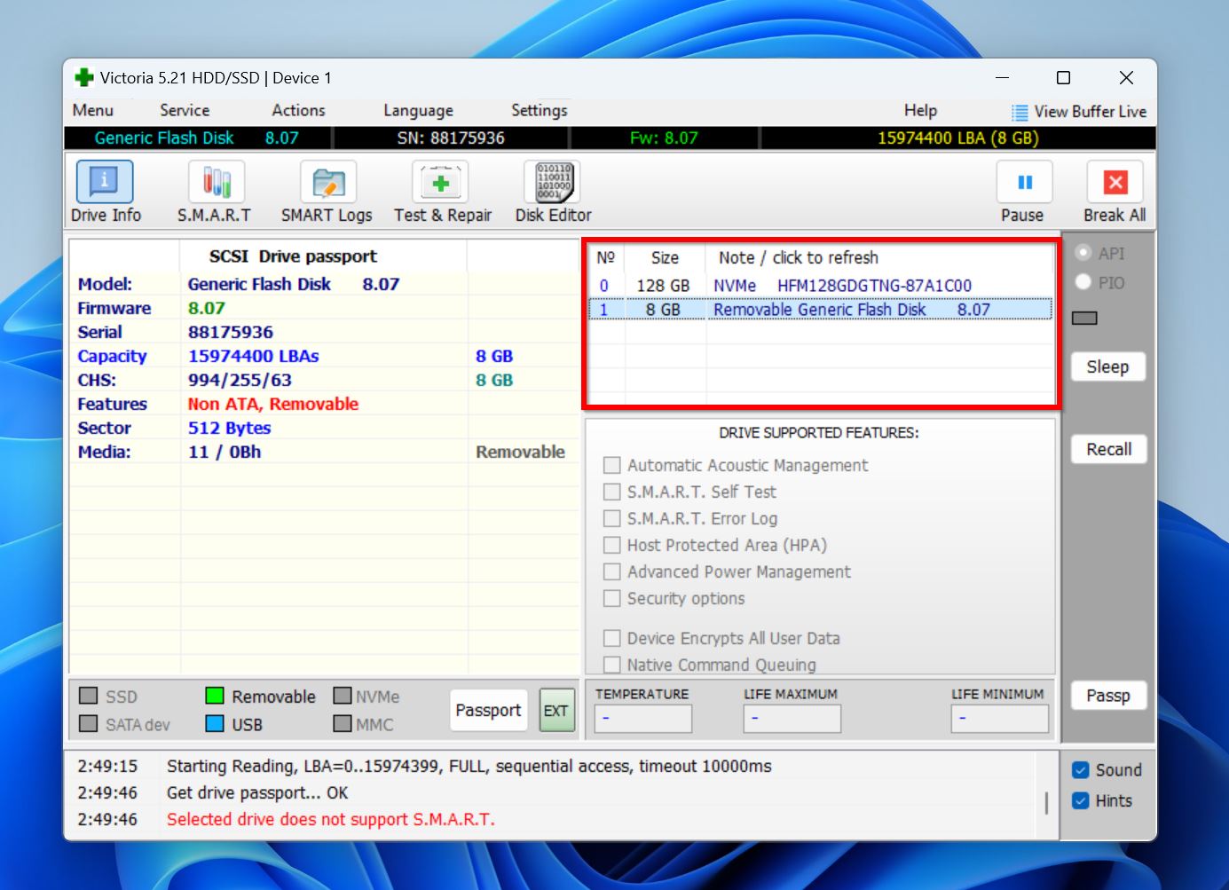 以下是如何使用 Victoria HDD/SSD 檢查筆式驅動器的運行狀況: