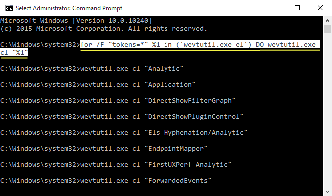 for /F “tokens=*” %1 in ('wevtutil.exe el') DO wevtutil.exe cl “%1”