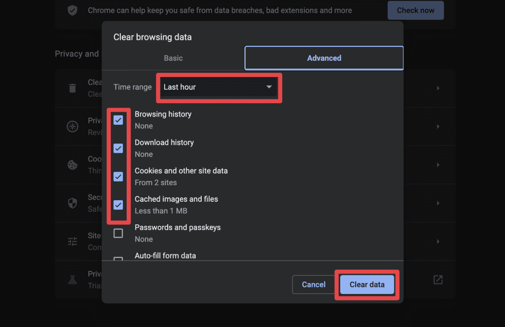 - 現在,點擊清除數據從您的瀏覽器中刪除這些項目。