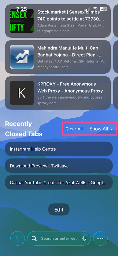 - 輕敲顯示全部查看所有最近關閉的選項卡。