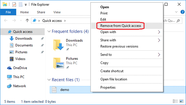 - 右鍵單擊要刪除的最近使用的文件夾或文件,然後選擇從快速訪問中刪除。