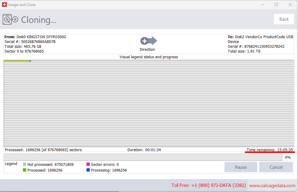 仔細檢查克隆選擇並確認開始克隆過程。軟件將顯示有關過程持續時間的信息。克隆的總時間取決於您的數據量和硬盤驅動器的速度。