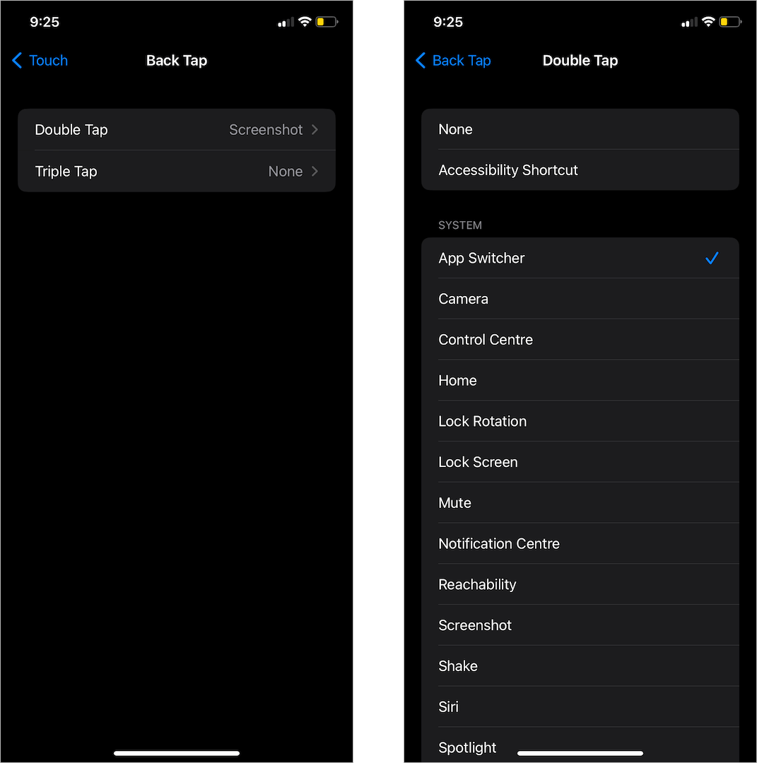 - 轉到“雙擊”並選擇應用程序切換器在系統類別下。您還可以將應用程序切換器分配給“三次點擊”操作。