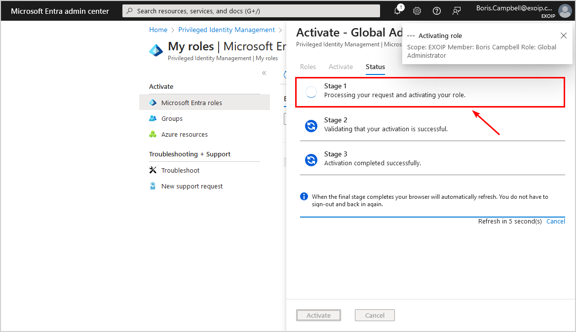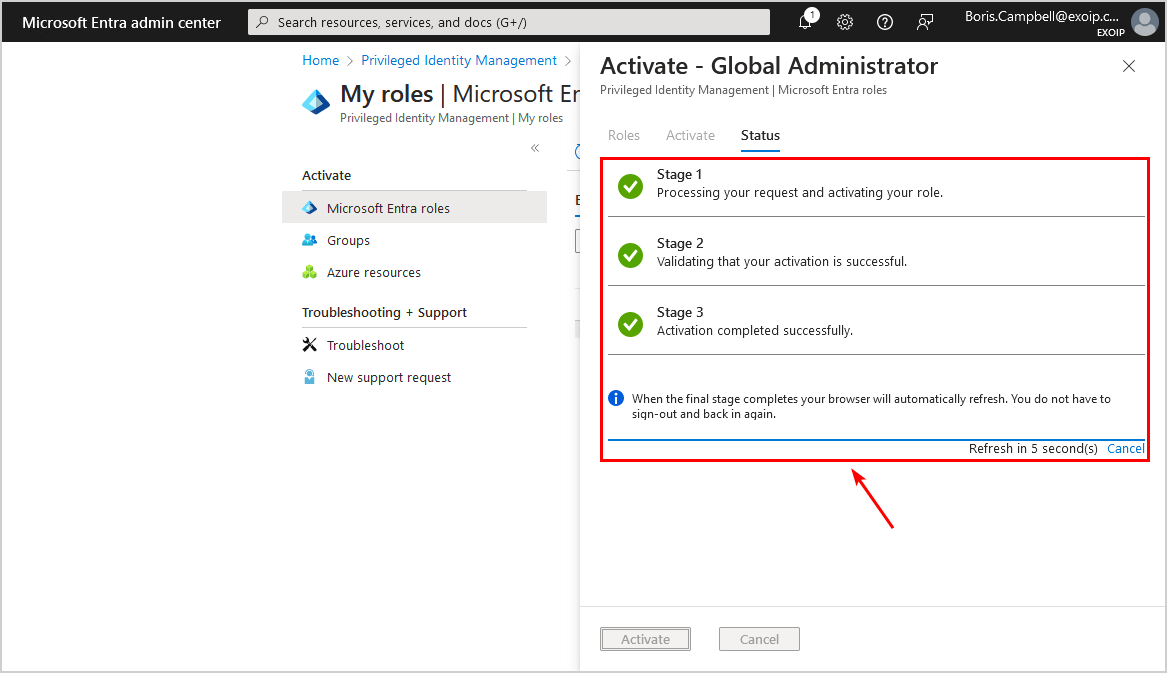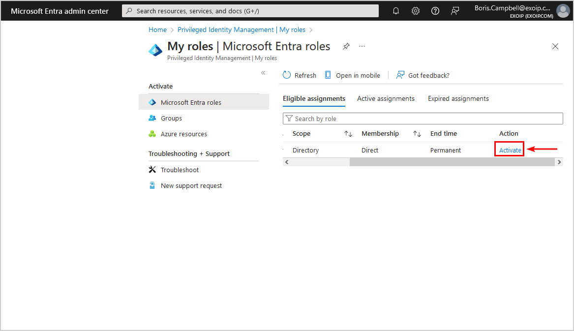 要在 Microsoft Entra 中使用 PIM 激活符合條件的管理員角色,請按照以下步驟操作: