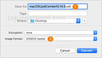 - 在彈出窗口中,選擇“桌面”作為目標。為了將 .dmg 轉換為 .iso,請確保選擇DVD/CD母帶作為圖像格式。點擊轉變。