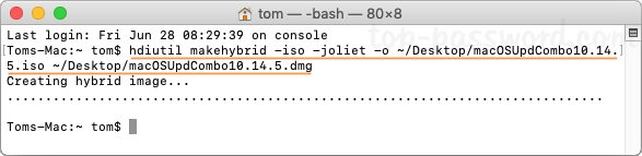 - 在終端窗口中輸入以下命令,假設您已將 .dmg 文件放在桌面上。