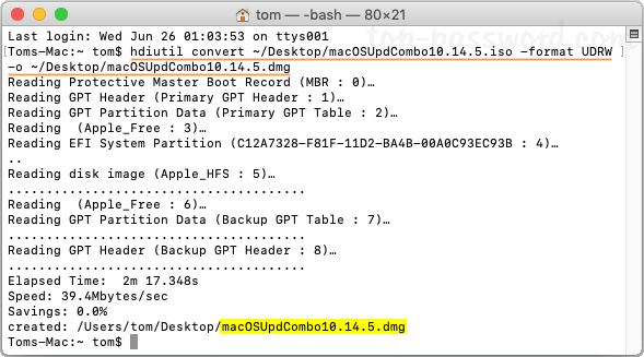 如果您需要將磁盤映像從 .iso 轉換為 .dmg,只需在終端窗口中執行以下命令: