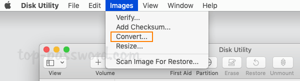 - 剛剛啟動磁盤工具(在/應用程序/實用程序中)。在屏幕頂部的菜單欄中,選擇圖片->轉變。