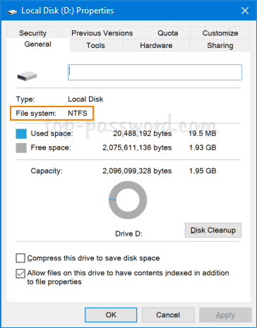 - 完成後,關閉命令提示符,您可以右鍵單擊該驅動器以訪問“屬性”並檢查文件系統是否已轉換為 NTFS。