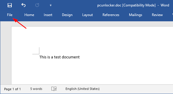 - 在 Word 2016 中打開 .docx 文檔,然後單擊文件菜單。