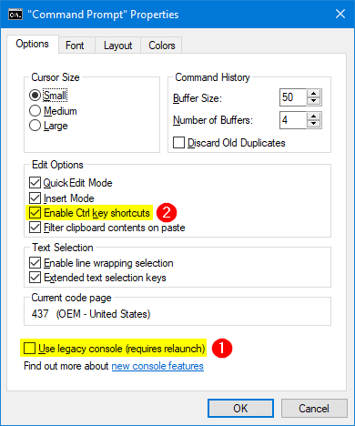 - 查看 ”啟用CTRL密鑰捷徑“。您可能必須檢查“使用Legacy Console(需要重新啟動)”複選框首先。