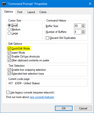 快速編輯模式可讓您使用光標直接在命令提示符中選擇文本。