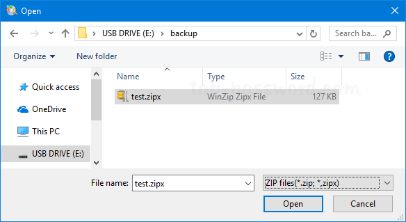 - 這將打開瀏覽器對話框。找到受密碼保護的 zipx 文件並單擊打開。