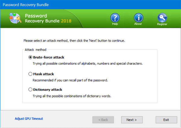 - 下一個窗口將提示您選擇密碼搜索方法:暴力攻擊,面具攻擊或者字典攻擊。