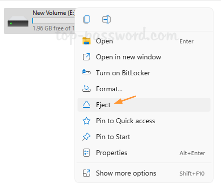 重新啟動後,Windows將自動卸下虛擬硬盤驅動器。您也可以通過在文件資源管理器中右鍵單擊驅動器來手動卸下驅動器並選擇噴射。