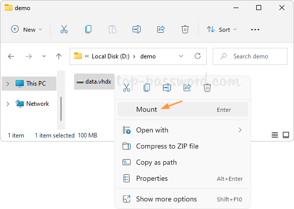 - 每當您需要將VHD/VHDX文件作為虛擬硬盤安裝時,只需在文件資源管理器中右鍵單擊它,然後選擇山。