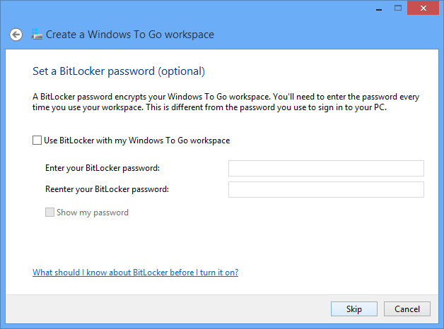 - 設置 BitLocker 密碼。通過使用 Bitlocker,USB 驅動器及其上的所有數據都將被加密。此選項不是強制性的,您可以通過單擊“跳過”按鈕來跳過它。