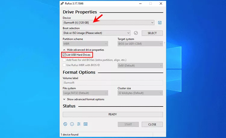 步驟 4:在 Rufus 上的驅動器屬性下,從設備下拉菜單中選擇您插入的 USB 驅動器。如果您插入的 USB 驅動器未出現在“設備”下拉菜單中,請選中“隱藏高級驅動器屬性”下的“列出 USB 硬盤驅動器”複選框,然後 USB 驅動器就會出現。