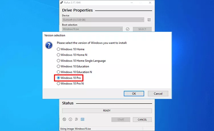 步驟 8:如果您添加的 Windows 10 ISO 文件包含多個 Windows 10 版本,則會打開版本選擇對話框,您需要選擇要安裝在 USB 驅動器上的 Windows 版本。