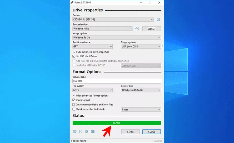 第11步:當底部的綠色狀態欄顯示時準備好,表示Windows to Go USB驅動器已成功創建。這時候你就可以退出Rufus了。