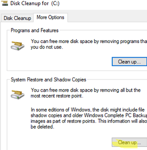 要刪除舊的還原點,您還可以使用內置的磁盤清理工具(cleanmgr.exe)。前往更多選擇選項卡並單擊清理在系統還原和卷影副本部分。