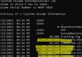 還原點映像文件存儲在位於每個驅動器根部的隱藏 System Volume Information 文件夾中。該屏幕截圖顯示了創建的每個還原點的捲影副本文件。正如您所看到的,它們的大小可以達到數十甚至數百 GB。