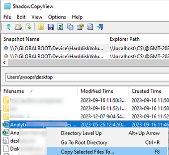 要查看卷影副本中的文件,您可以使用免費的卷影複製視圖工具 (https://www.nirsoft.net/utils/shadow_copy_view.html)。瀏覽所需的捲影副本(按創建日期排序),找到該文件(文件夾)的先前版本,並將其恢復到光盤上的特定位置(將選定的文件複製到...)。