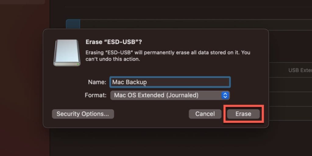 - 單擊擦除按鈕以格式化USB驅動器。這將刪除驅動器上的所有數據,因此請確保您備份了所有重要的文件。