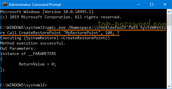 wmic.exe /Namespace:\\root\default Path SystemRestore Call CreateRestorePoint "MyRestorePoint", 100, 7