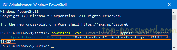 powershell.exe -ExecutionPolicy Bypass -NoExit -Command "Checkpoint-Computer -Description "MyRestorePoint" -RestorePointType "MODIFY_SETTINGS""