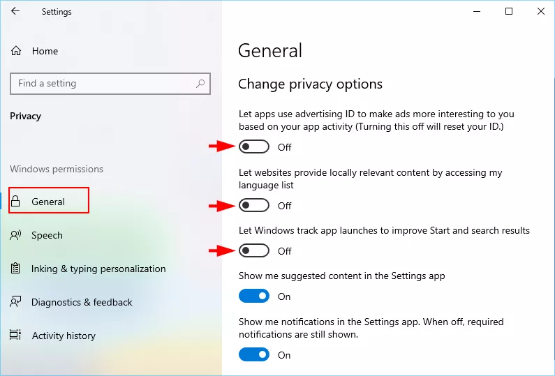 步驟2:關閉不必要的跟踪選項,例如:讓應用程序使用廣告 ID 進行個性化廣告、允許網站訪問語言首選項、跟踪應用程序運行以改進“開始”和搜索結果。
