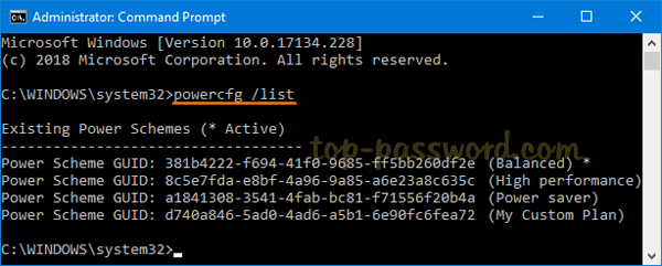 - 以管理員身份打開命令提示符。運行powercfg /列表命令,它將列出系統中所有現有的電源計劃及其 GUID。