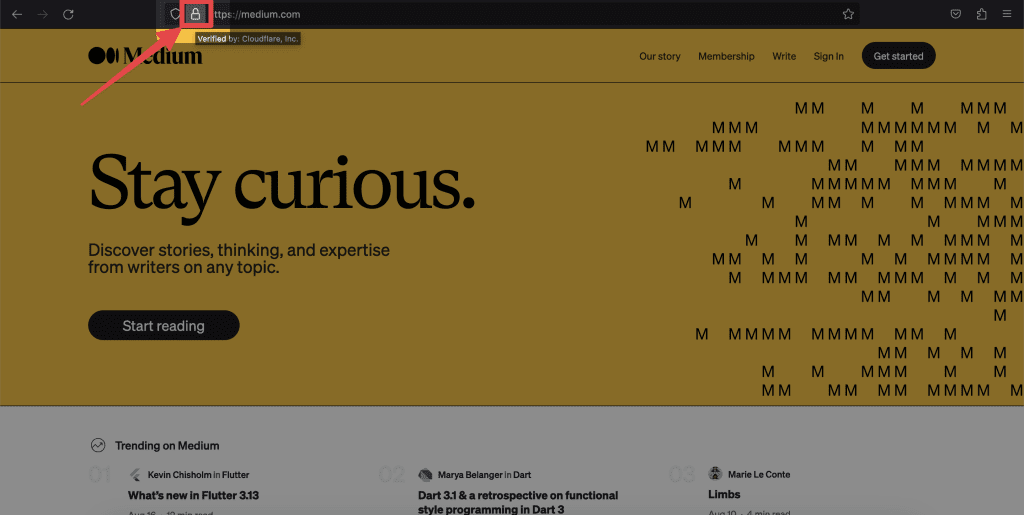 - 您將在地址欄中網站 URL 的左側看到一個圖標。這可能是一個掛鎖(對於安全站點)或我圍成一個圓圈(對於非安全站點)。單擊此圖標。