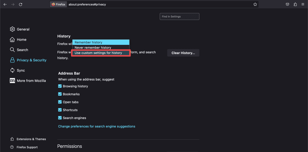 - 向下滾動到歷史部分並找到旁邊的下拉菜單火狐將會。